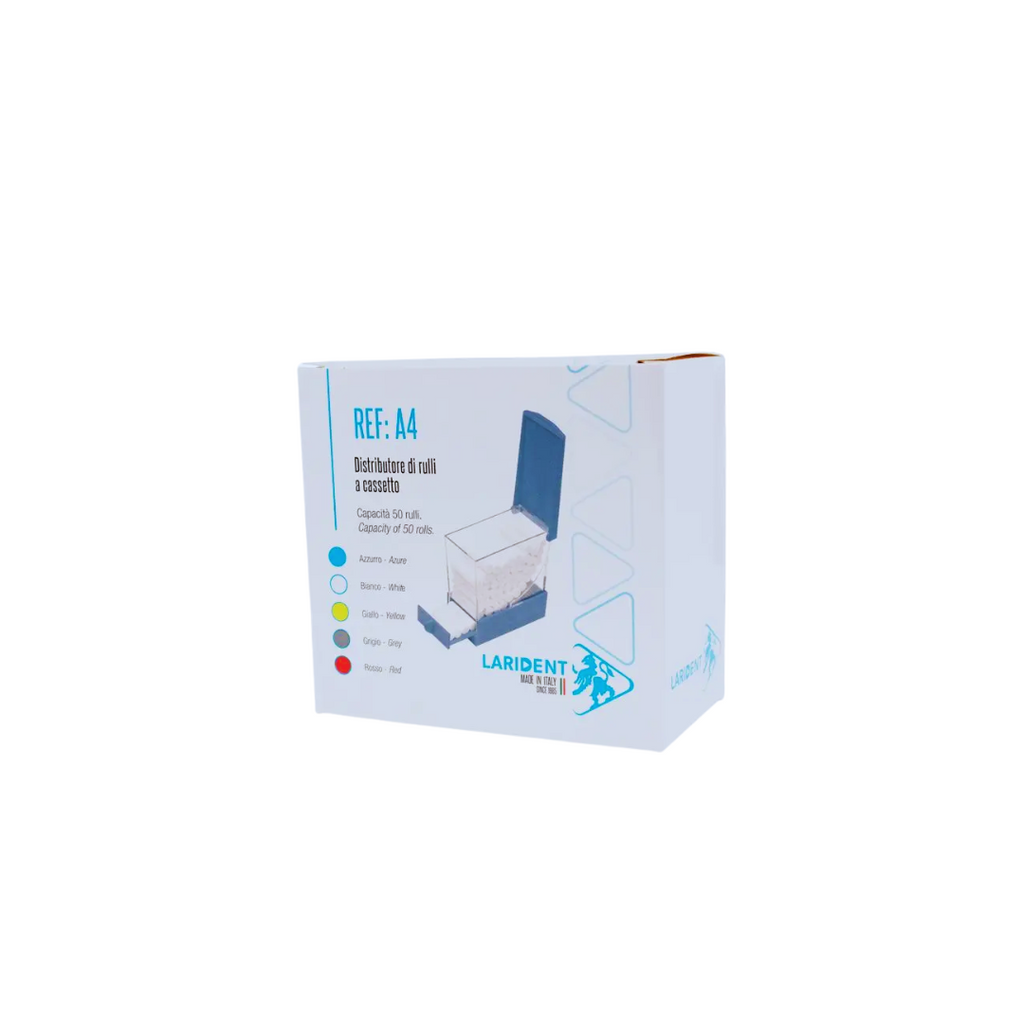 El Portarrollos de Algodón Larident-Italy es un dispensador dental profesional de fabricación italiana diseñado para mantener organizados y accesibles los rollos de algodón en el consultorio dental, garantizando higiene y eficiencia durante los procedimientos odontológicos.