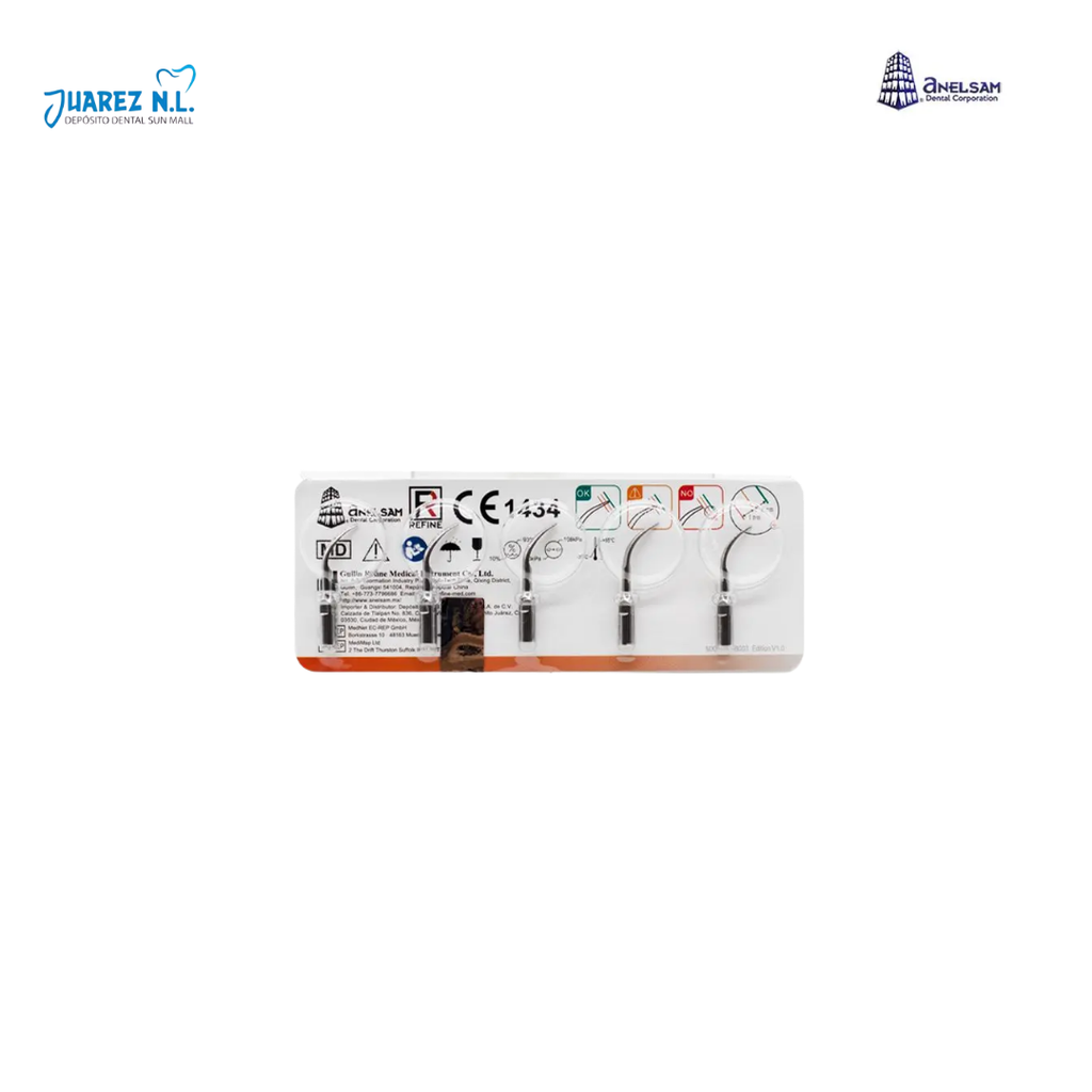 Puntas de repuesto para equipos Cavitrón, especialmente diseñadas para procedimientos de limpieza dental. Paquete con 5 unidades.